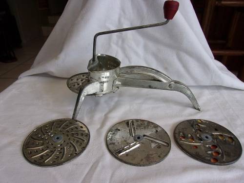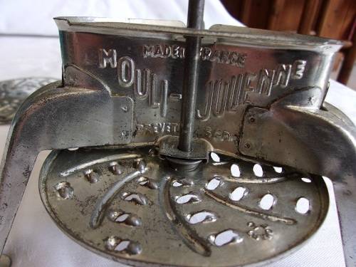 Vintage Mouli-Julienne Brevet SGDG with 4 cutting disks. This old utensil would have been produced in France in the 1950s.It would have been used to shred, slice or grate vegetables. The utensil comes with 4 cutting disks, and is in good condition.