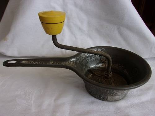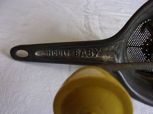 Vintage Mouli-Baby hand mill food processor. This old food processor was produced in France in the early 1960s. It was designed for processing foods into purées, designed specifically for pureeing soft fruits and vegetables for baby foods. The stamp marked on outside reads "Breveté SGDG - Made in France" and MOULI-BABY is stamped into the handle. It is in good condition.