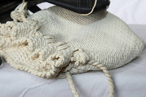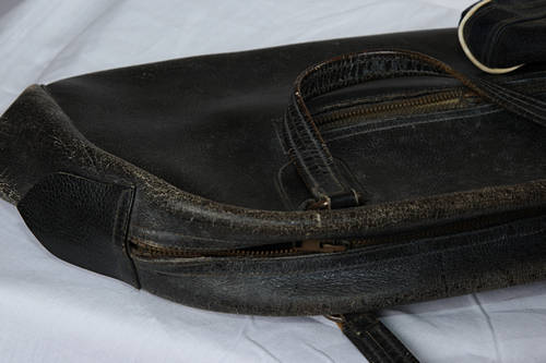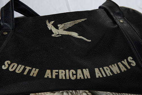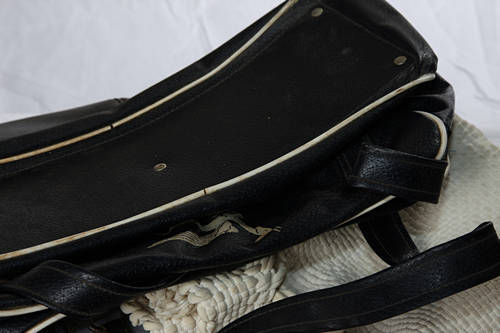 SAA zipped travelling bag, leather zipped bag, old 'cloth', knitted or crocheted not sure lady bag