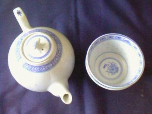 3-pc Oriental tea set in the rice grain pattern, decorated with blue. Consists of small teapot plus 2 cups/bowls. Teapot measures 9.5cm to top of lid. Bowls measure 7.5cm in diameter and 5.5cm in height. Absolutely no damage.