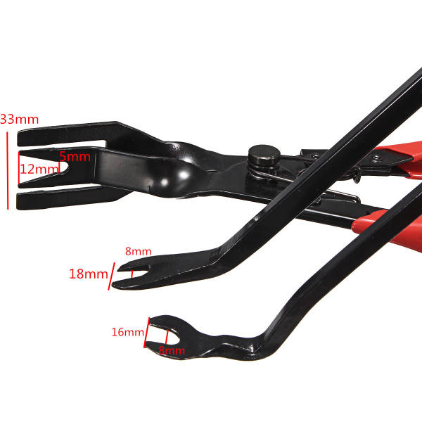 Package weight: 0.43 kg 3Pcs Car Door Steel Panel Trim Clips Plier + Fastener Remover Puller Tools Specificaiton: Material: Polypropylene handle + steel Color: Red + black Pliers Size: 24cm length Screwdriver: 23cm length, 30cm length Features: * Light and easy to use. * Polypropylene handle, high quality steel clamp body. * Spring design, the use of effort, convenient and quick. * Application: Car,door,loudspeaker,light ... Package included: 3 x Pliers More details:
