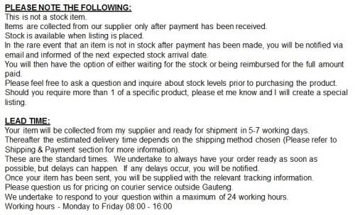 R35.00 Standard shipping using one of our trusted couriers applies to most areas in South Africa. Some areas may attract a R30.00 surcharge. This will be calculated at checkout if applicable.
