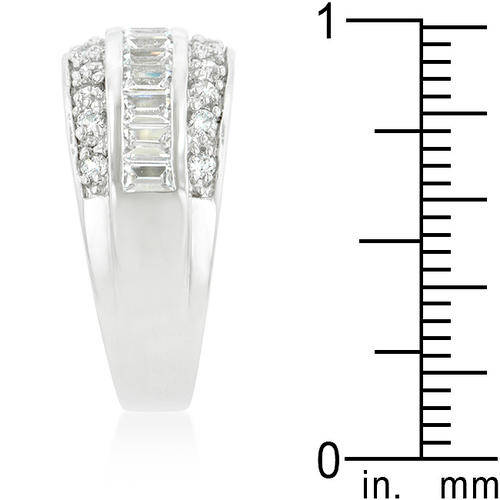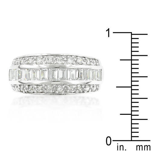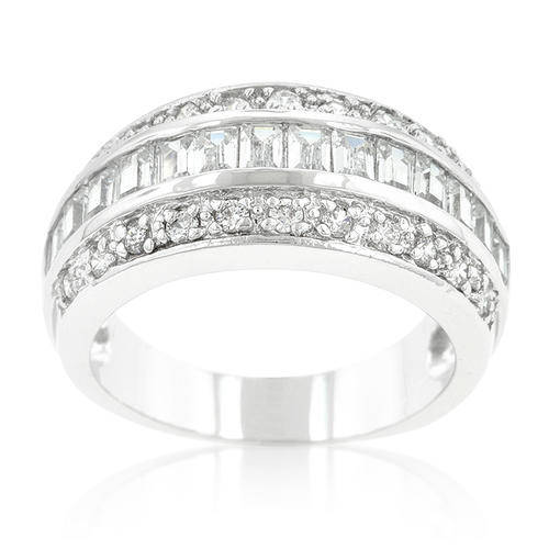 White Gold Rhodium Bonded 3-Row Classic Ring with Channel Set Rows of Round Cut and Emerald Cut Cubic Zirconia in Silvertone
