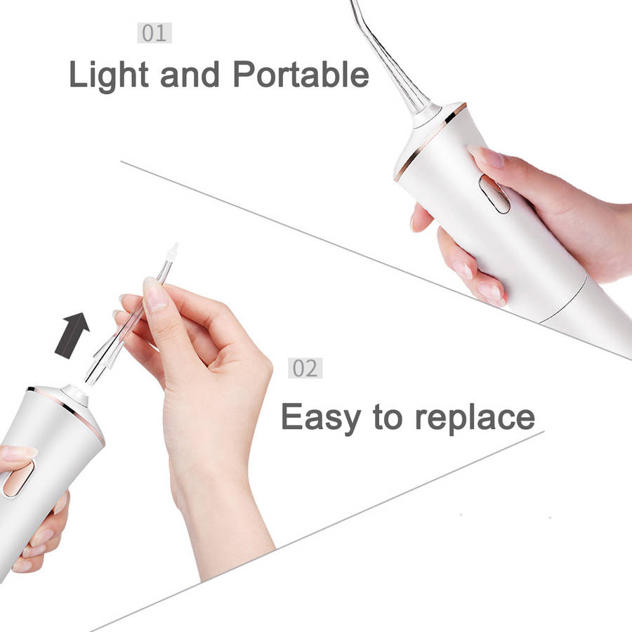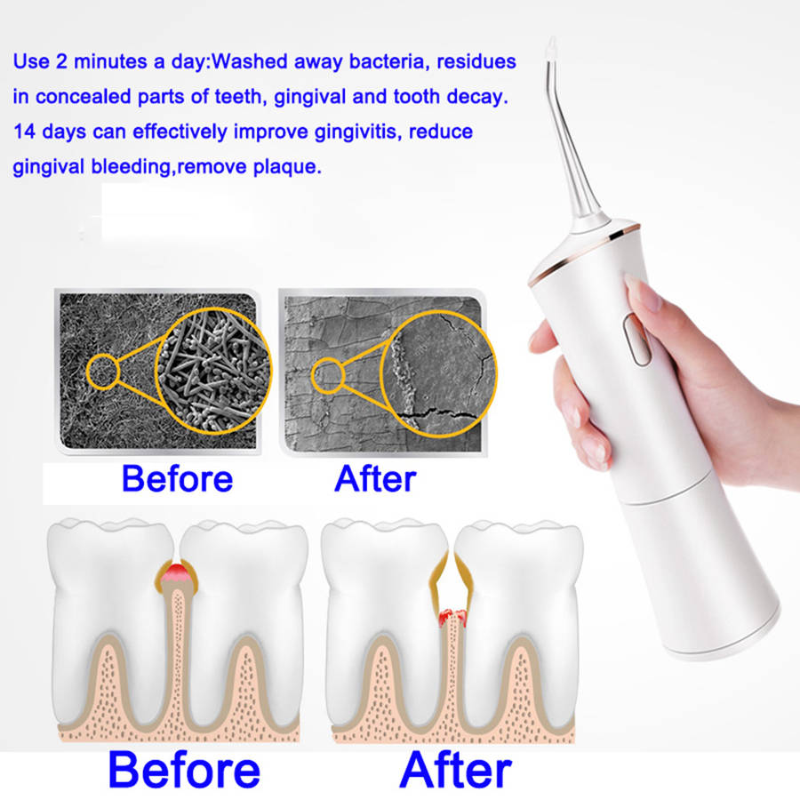 5.2 minutes and 14 days of health in your mouth:Using the tooth punching device for 2 minutes every day to wash away the bacteria and residue in the hidden parts of the teeth, Gums and cavities. The 14 day can effectively improve the Gums disaster and reduce the Gums bleeding and remove dental plaque.