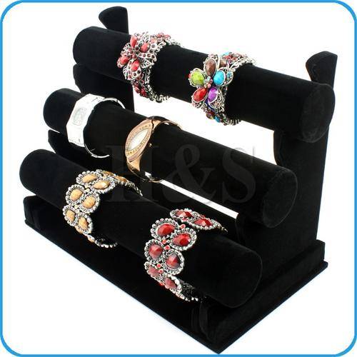 This Black Elegant velvet Three Tier Watch/Bracelet Displays showcase. It provides easy viewing of merchandise on a sophisticated black velvet background. Ideal for displaying Bracelets, Bangles and Watches in Shop windows, at Craft Fairs and most importantly of all, for boosting sales.