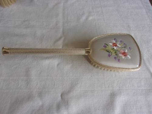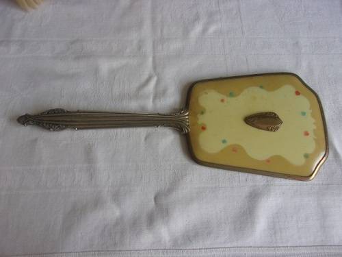 3 Vintage dressing table brushes & 2 hand mirrors for 1 bid. I would date this lot of mixed brushes and mirrors to the 1950/60s. There are 3 brushes - a faux tortoise shell hair brush, a floral backed hair brush and a Delina clothes brush. There are 2 hand mirrors - a yellow backed mirror and a silver colour floral backed mirror. The items are in fair condition - the floral backed brush has some water damage to the backing. Great buy - 1 bid for the lot.