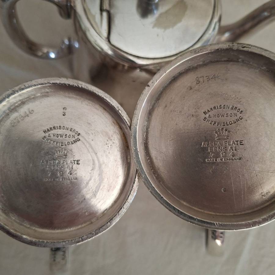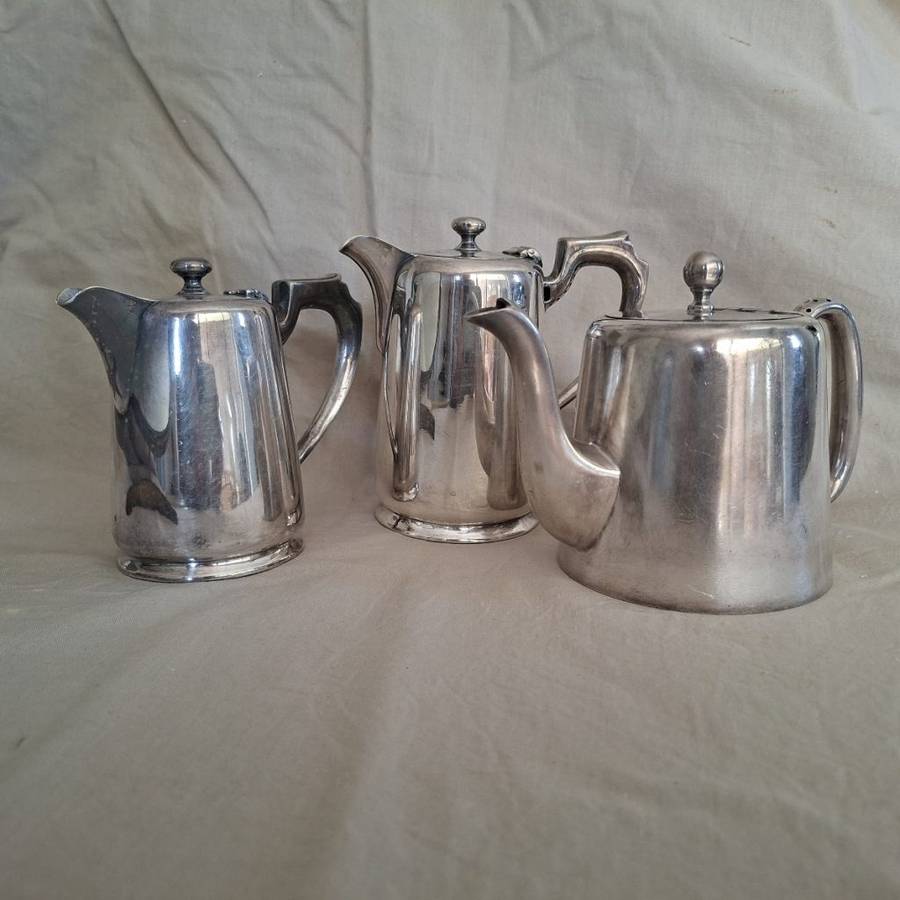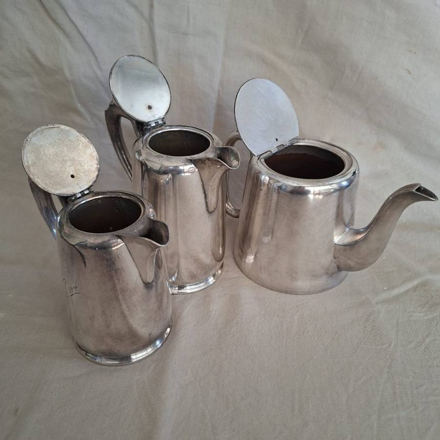 Three very nice strong hotelware items. Tea Pot - 4 cups. Hot water jug and milk jug. These are "sheffield and the teapot shows "10 cwt silver" Some wear use showing on the lids but generally in good used condition. A name embossed on the two jugs. Dont hesitate to ask any questions. Please look at pics they are part of my description.