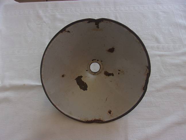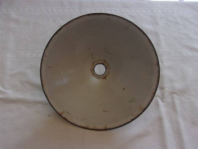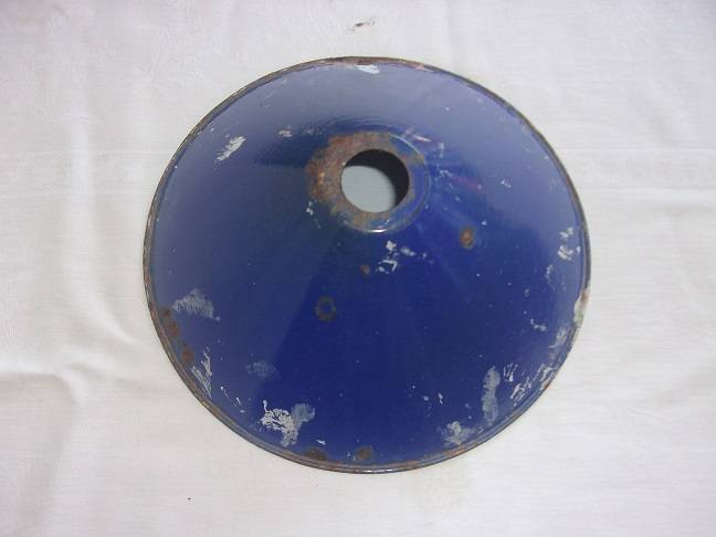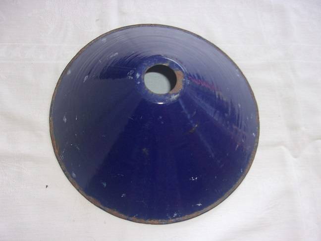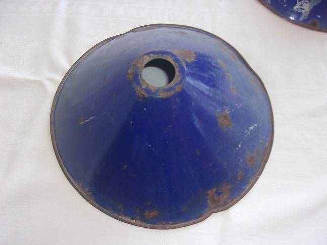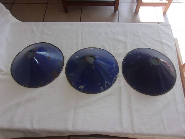 3 Vintage industrial navy blue conical enamel pendant light shades for 1 bid. I would date these 3 enamel light shades to the 1930s. They are blue conical enamel shades with a white enamel interior. They are 25.5cm in diameter and have some age wear which adds to the character. Bidding is just for the shades, and fittings will have to be installed.