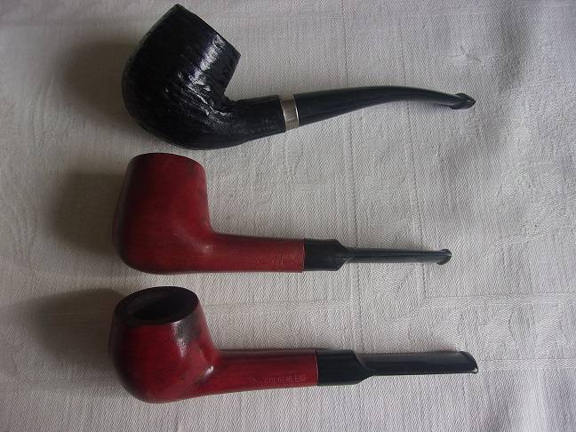 3 Vintage tobacco smoking pipes for 1 bid. I would date these smoking pipes to the 1980s. The lot consists of a Golden Leaf 321 pipe, a Golden Leaf 323 pipe and A dark rustic smoking pipe. They are all in good used condition. Great buy - 1 bid for the lot.
