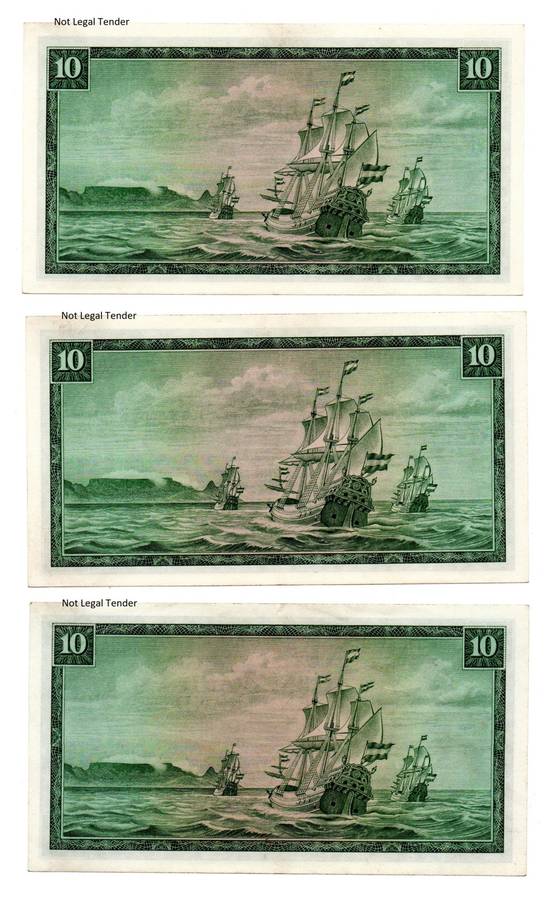 3 x 1966 South Africa G Rissik Type 5, Second Issue R10 Notes (2 in Afr, 1 Eng)