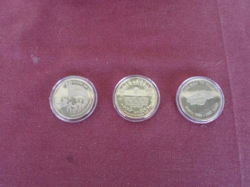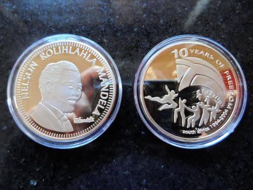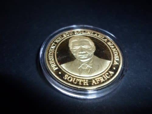 3 X MANDELA GOLD PLATED COINS IN VELVET BOX EACH COIN IN PLASTIC CAPSULE