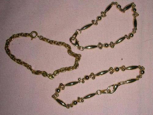 2 are the same and the other is a Gucci design. I was going to create something using vintage beads but never got around to it. They are lovely bracelets. The Gucci one is older than the other 2 and is not as shiny. It almost looks like real gold but there is NO stamp anywhere. You can add charms as well. Nice stocking fillers for Christmas.