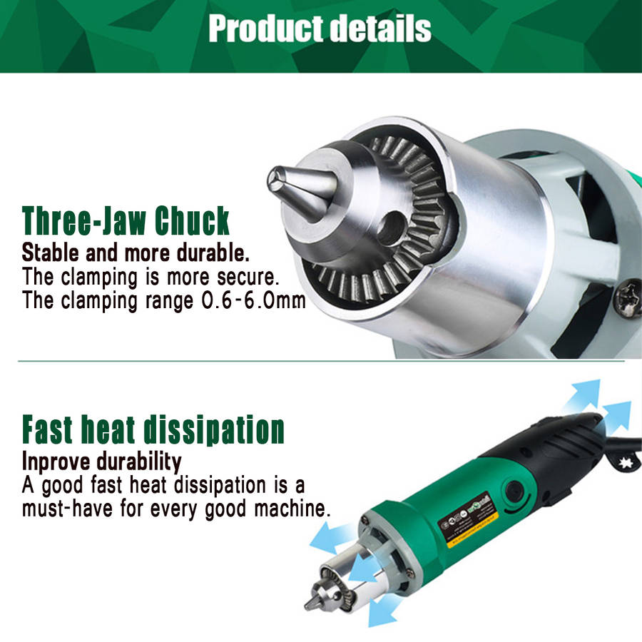 Specifications: Color:Red, Green Plug:US Plug(110V), EU Plug(220V) - will provide adapter according to delivery country Max. Input Power: 480W Speed: 1-6 Speed Clamping Diameter: 0.6-6 mm Frequency: 50Hz/60Hz No-Load Speed: 30000rpm Chuck Diameter: 6mm Grinding head diameter: 25mm Features: - 6-speed adjustment to meet your different needs - Fast heat dissipation and durability - Application:jewelry , home , and wood making - Function :For Wood/ Metal/ Ceramic/ Plastic, Drilling, Polishing, Grinding, Carving, Shaping and Sanding. Package Included: 1 x 480W Electric Grinder 4 x Grinder Head 1 x Wrench 1 x English Manual