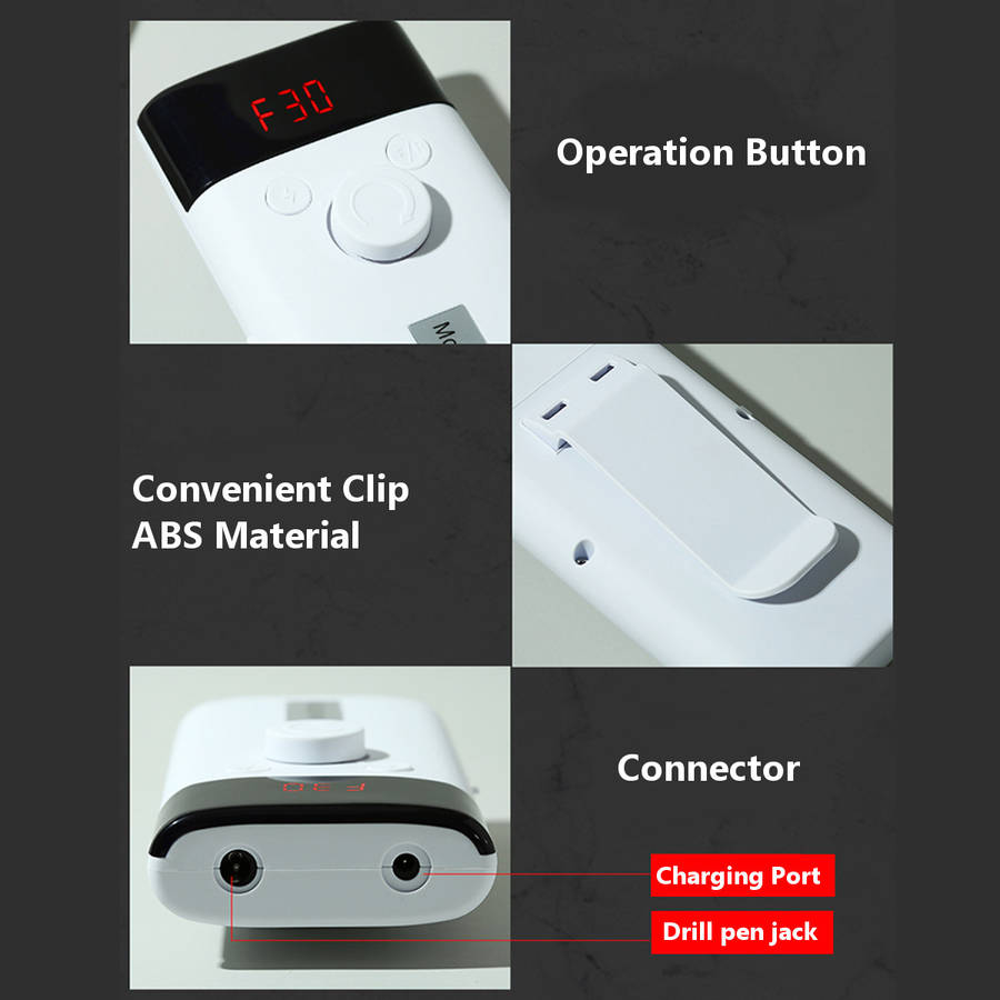Features: 1.Electric nail drill is made of ABS plastic and copper heads, light weight, suitable for long time work.With 6 tips, 6 nylon wheels for manicure or pedicure. 2. Rechargeable: After about 4 hours charged, this nail drill can use without plugging in the outlet and lasts 12-hour operation time. 3. Fast: High-powered, low heat and low noise with a high and adjustable RPM(0-30000 RPM), which can work smoothly and fastly. 4. Portable: With its compact size and light weight, it can be easily to install and disassemble, you can hang it on your belt, waist, also can be packed into your traveling bag, which is convenient to carry with you. 5. Easy to operate: It has a manual switch that can be controlled to start / stop rotating, and the F-Forward and R-Reverse buttons to change direction. 6.Having grinding, polishing, engraving,peeling, sanding, carving radian function, suitable for natural nails as well as artificial nails. 7. It is ideal for both professional use in salon and beginner use at home, giving you an enjoyable manicure or pedicure experience.