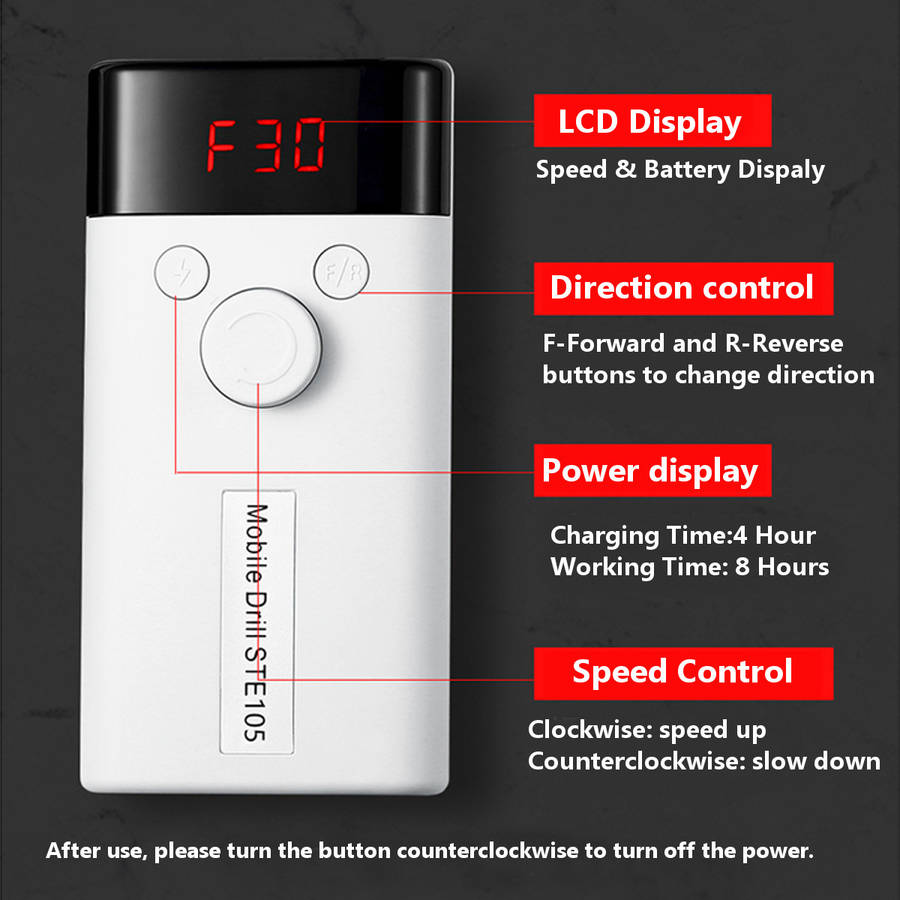 Description: Item Name:Electric Nail Drill File Set Color:Pink/White/Black Rated Voltage:100-240V Speed:0-30000RPM Battery Capacity: 2000mAH*3 Voltage:12.6V Charging Time:4 Hour Working Time: 8 Hours Size:approx.125x50x24mm/4.93x1.97x0.95 Feature:Speed Adjustable/Forward and Reverse Adjustable