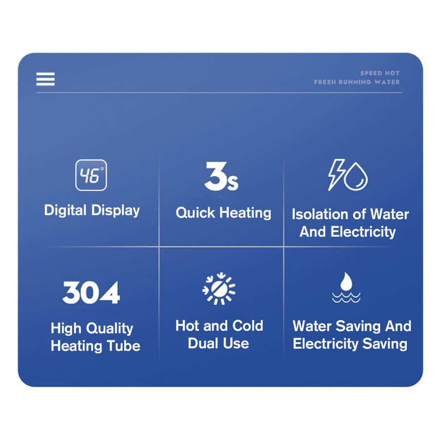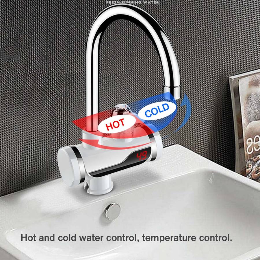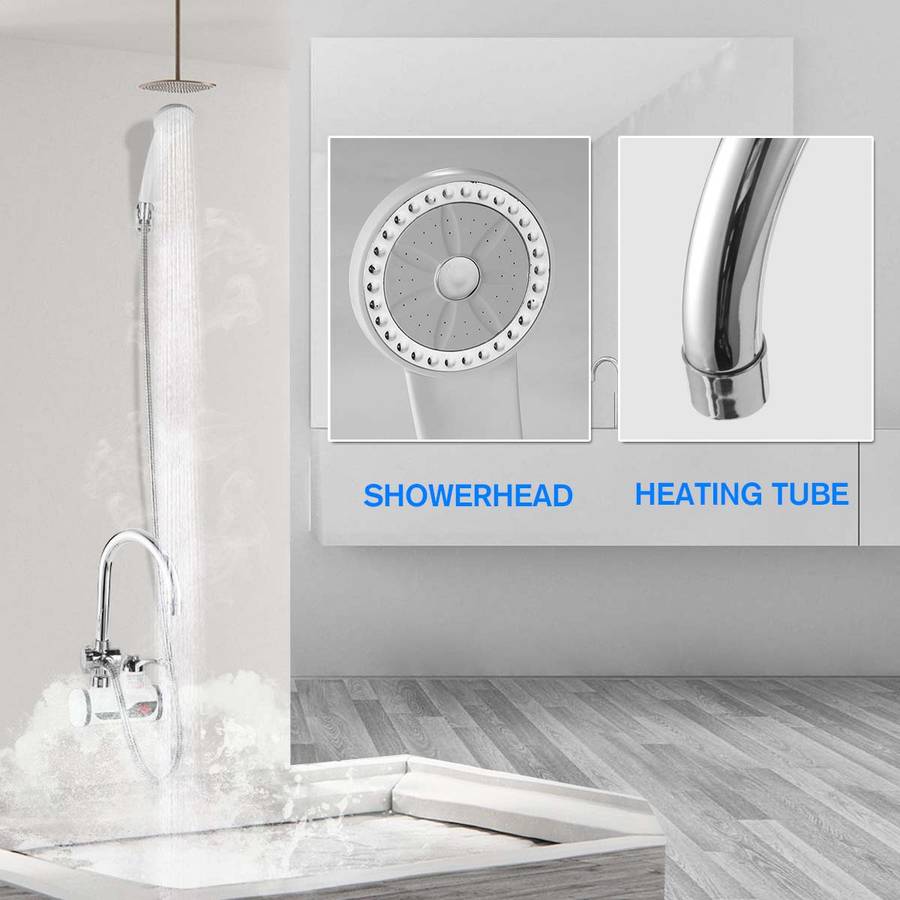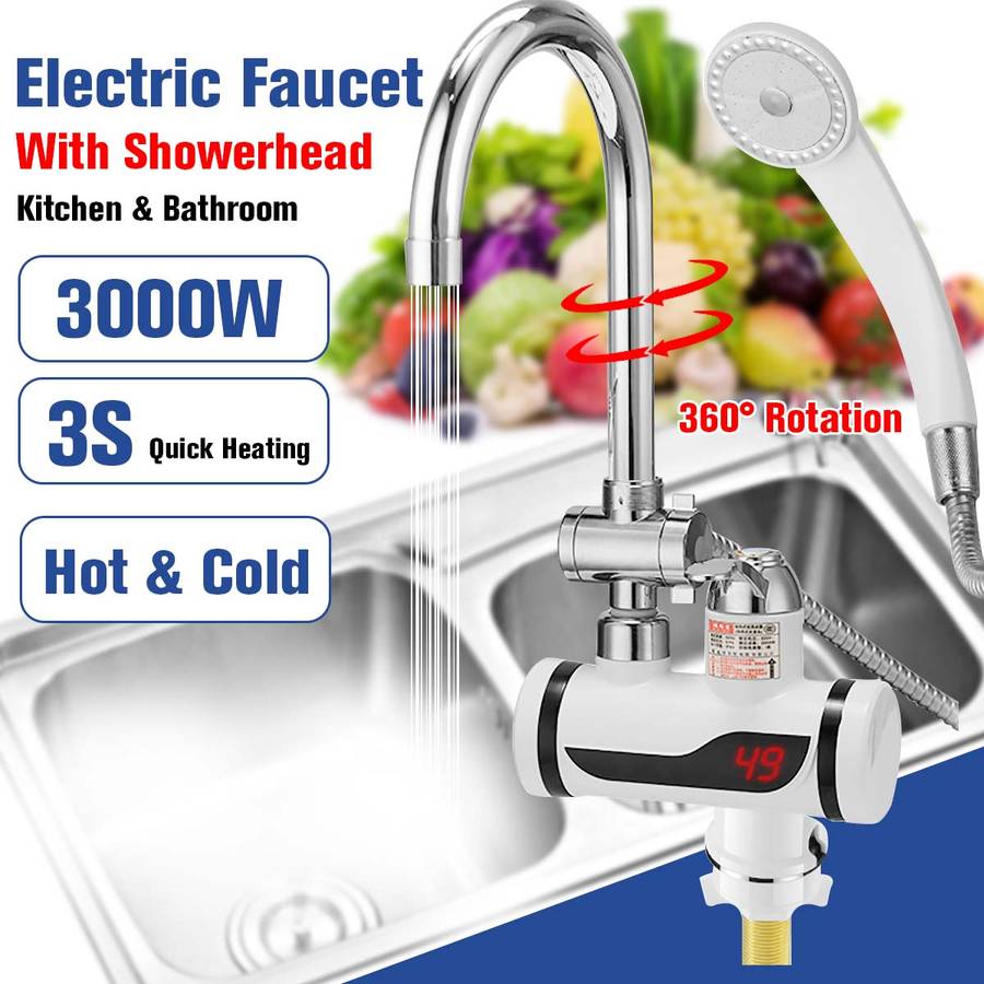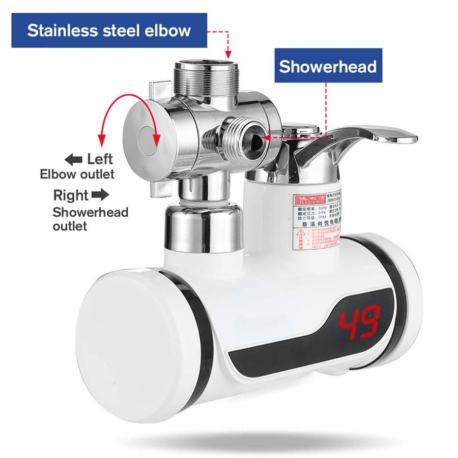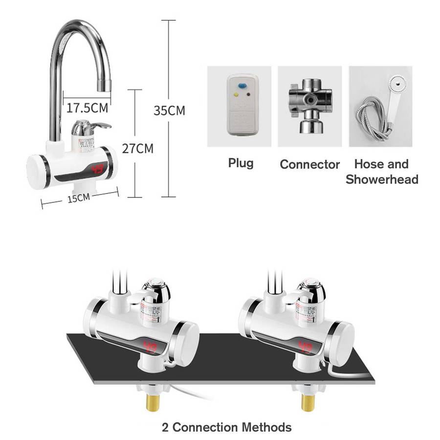 Specifications: Type: Single Handle And Multiple Hole Elbow and Heating Tube Material: Quality 304 Stainless Steel Rated Voltage: 220V/50HZ Rated Power: 3000W Waterproof Grade: IPX4 The Inlet Way: Under the influent Water Pressure: 0.04-0.5 MPa Rotation: 360ᆪ Rotatable Hose Length: 1.2M Features: - 3 seconds quick heat. - Limescale-proof design. - Highly sensitive hot-melt power-off. - Double isolation of water and electricity to ensure safe use. - The faucet can be controlled to be 360 degrees of rotation. - It can be used directly on the faucet without any special equipment. - ABS environmental plastics, high temperature resistant, soft and strong, not easy to burst. - Convenient, simple, and easy to install, It can be used in kitchen, toilet, etc. - Hot and cold dual use. Temperature display screen, the current temperature is clear at a glance. - Strong anti-stamping, so that the product is not easy to aging, security is more durable and lasting. - No need to store water for preheating and no need to keep warm. To avoide heating too much water and a waste. Package Included: 1 Pc x Instant Hot Water Tap 1 Pc x Hose 1 Pc x Three Way Connector 1 Pc x Showerhead 1 Pc x Plug(AU)(Distribute the adapter according to your country.)