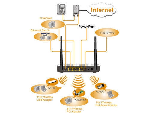 - W300D ADSL2/2+ router, Power Adapter, Voice Splitter, Network Cable, 2x Telephone Lines