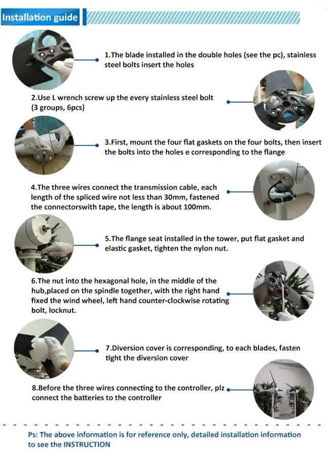 1.1 Please make sure the output voltage of wind generator is consistent with rated battery voltage. 1.2 Please connect the cables of plus-n-minus of battery firstly and then connect the three cables of wind generator. 1.3 Please make sure you connect battery and wind generator with controller according to this instruction, opposite polarity or wrong position connection will result in abnormal operation of system or damage of system components. 1.4 When operating hand braking, please make the smaller red cable and battery anode in short circuit, then controller will brake. Disconnect the smaller red cable, hand braking function will be cancel.