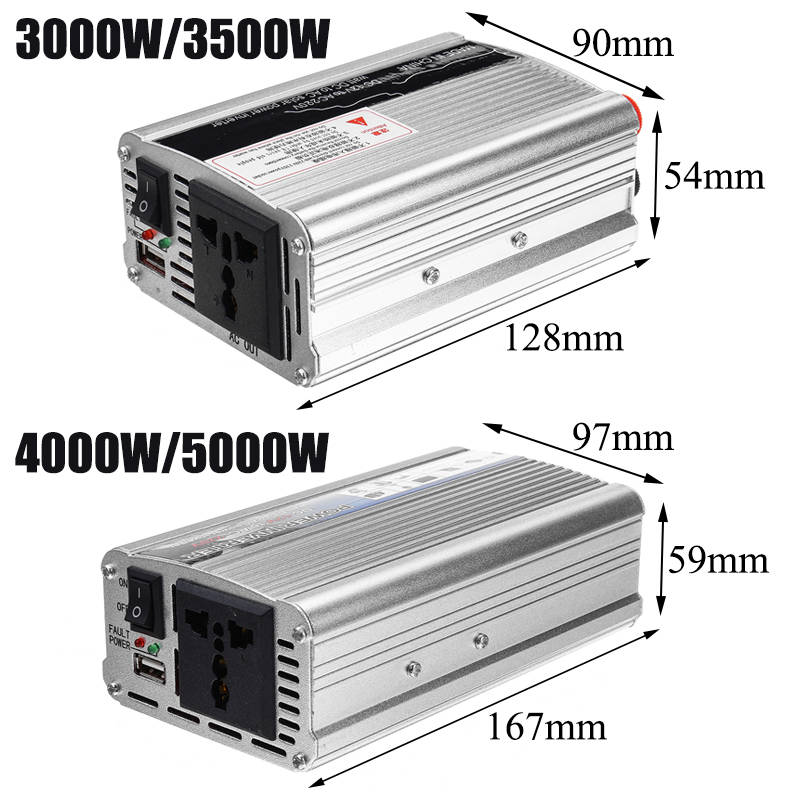 Specifications: Color: Sliver Frequency: 50+/-3Hz Input Voltage: DC12V Output Voltage: AC220 Power: 3000/3500/4000/5000/6000W Wave Form: Modified Sine Wave Form