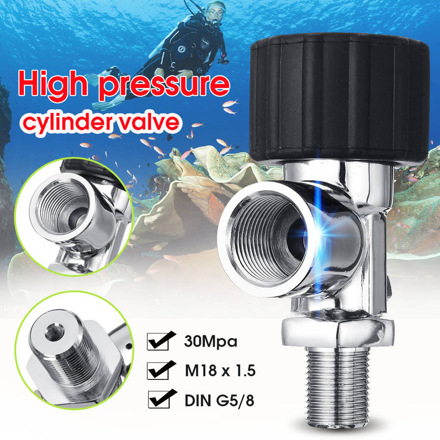 Specification Name:High pressure cylinder head valve Model:B28408 Size: 10X4.5cm approx. Material:Copper Working pressure: 30Mpa Import connection thread: M18 x 1.5 Outport Thread: DIN, G5/8 Internal Thread Feature * With safety explosion-proof disc. * The interface is DIN. * International Standard connecting thread and outlet threads * Universal for air respirator or DIN interface diving equipment. * High performance
