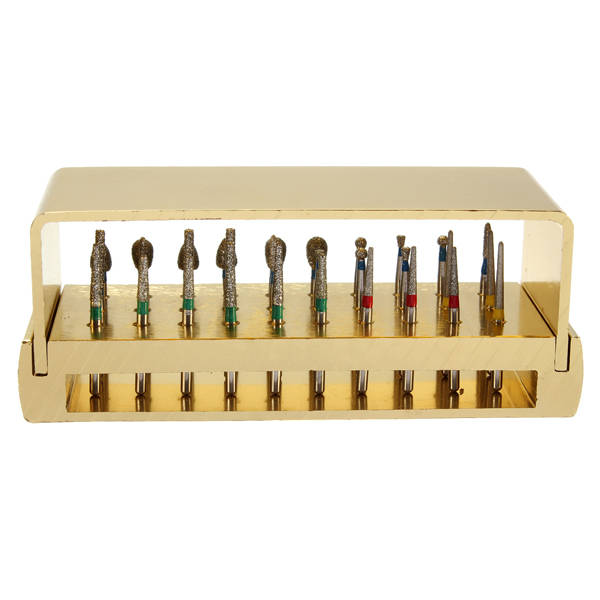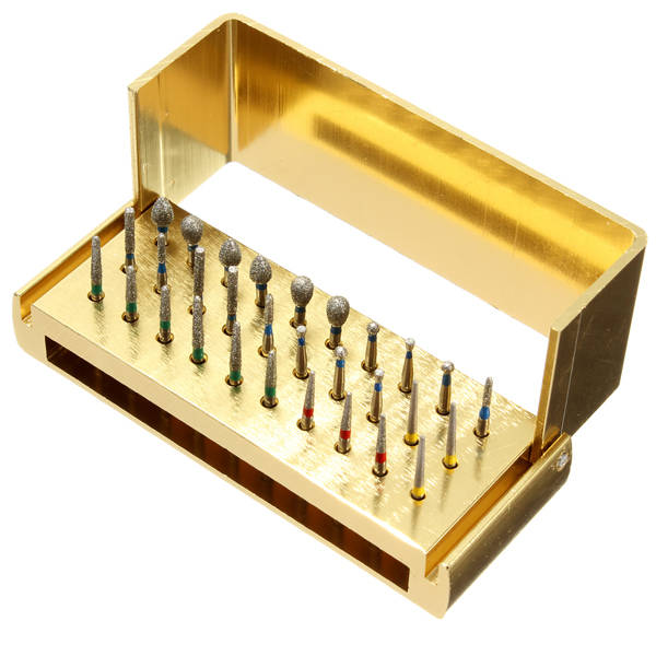 Package weight: 0.05 kg Description: 30pcs Diamond Polishing Grinding Heads Diamond Disinfection Burrs High Speed Handpieces This item includes 30 pieces of burs with a metal disinfection holder.