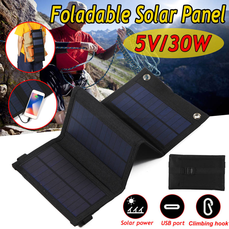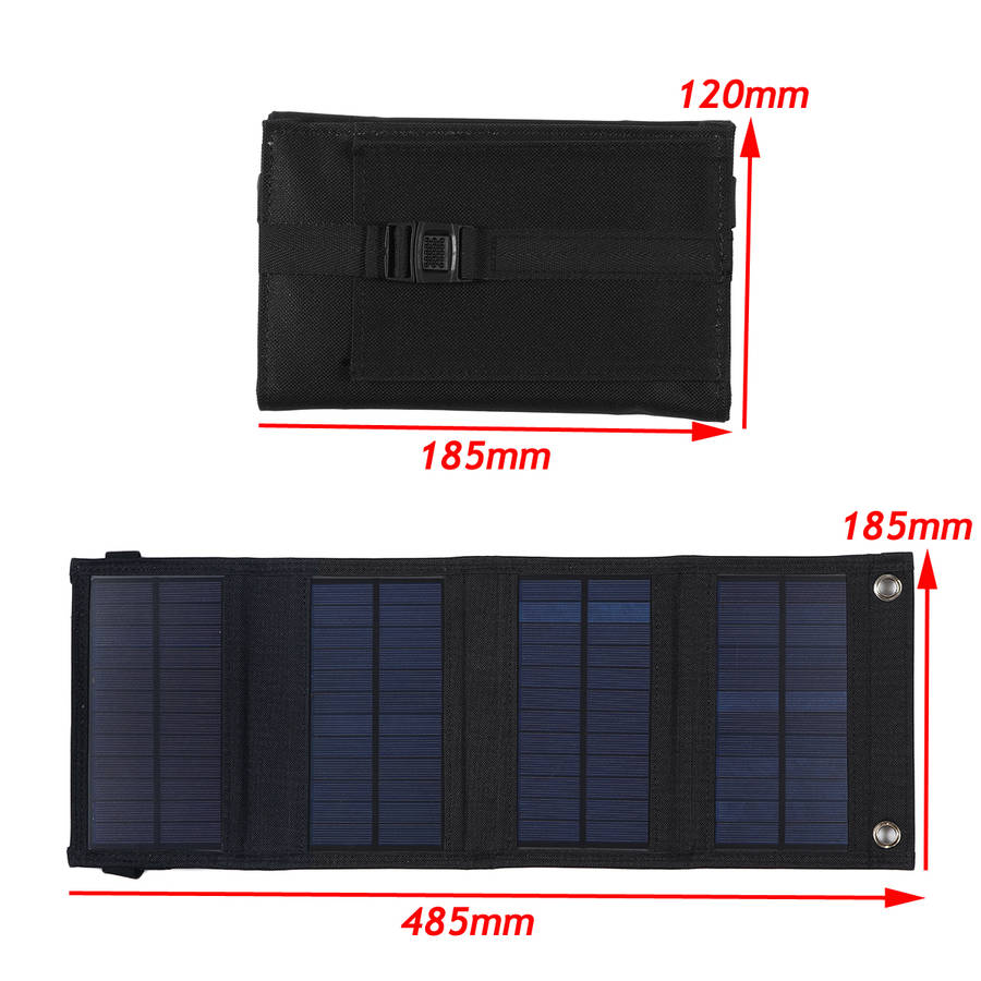Features: a Eco-friendly & durable material. a Applied in charging 5V device as a power bank. a Portable, foldable and lightweight, with buckle to be fold firmly. a Come with storage bag to hold you phone when charging. a Come with 4x carabiners to mount it to your backpack or tent. a Produce continuous stable output even in cloudy day. a Suitable for outdoor activities, outdoor working or emergency. Main Parameters: Pmax: 30W USB Output Voltage: 5V Quantity of Single Panel: 4Pcs Material-Panel: PET Laminated Sunpower Mono-crystalline Cells Material-Bag: Nylon Color:Black Size & Weight: Expanding size: 485*185MM Folding size: 185*120MM Package Included: 1X 30W Foladable Solar Charger w USB Port 4X Carabiner