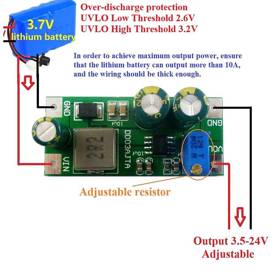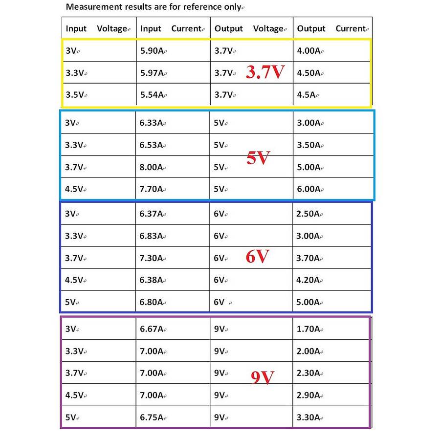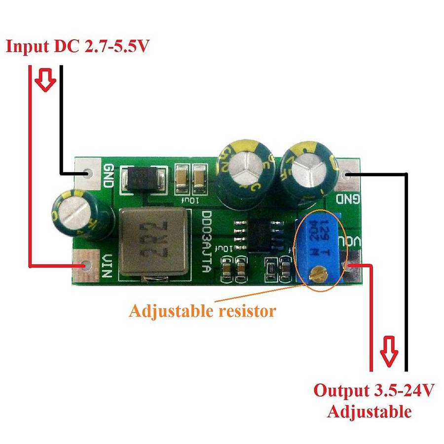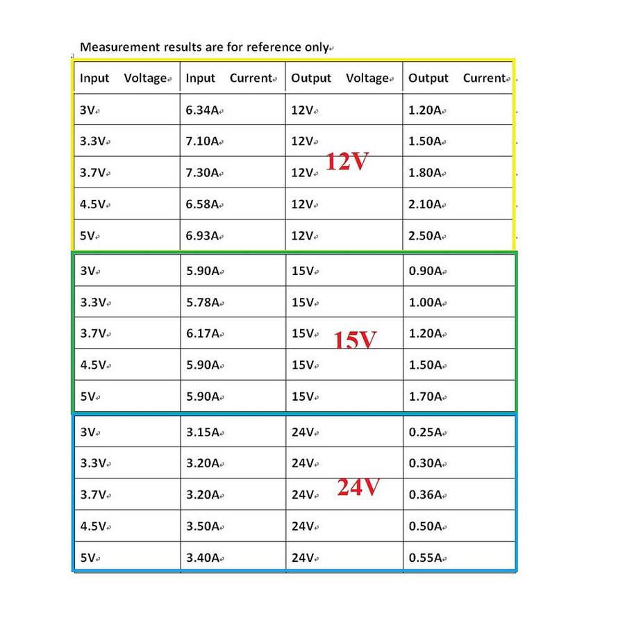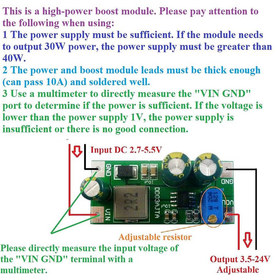 Description: Input DC 2.7-5.5V, Adjustable Output DC 3.5-24V Maximum output power 30W Maximum input current: 8A Maximum output current: 6A Quiescent current: about 1mA Efficiency : >=96% Switching Frequency : 600KHz fixed Overtemperature shutdown, input under-voltage protection and short circuit protection. UVLO Low Threshold 2.6V,UVLO High Threshold 3.2V,suitable for 3.7V lithium battery power supply Operating Ambient Temperature : -40 to 85 ᆪC Storage Temperature : -55 to 150ᆪC Size : 45x20x15mm Attentions: This is a high-power boost module. Please pay attention to the following when using: 1. The power supply must be sufficient. If the module needs to output 30W power, the power supply must be greater than 40W. 2. The power and boost module leads must be thick enough (can pass 10A) and soldered well. 3. Use a multimeter to directly measure the ''VIN GND'' port to determine if the power is sufficient. If the voltage is lower than the power supply 1V, the power supply is insufficient or there is no good connection. 4. Input voltage can not be greater than the maximum input range 5. Output power can not be greater than the maximum load for a long time 6. Input power must be greater than the output power, because the power consumption of the module itself Applications: for QC2.0 3.0 charger for 3.7V li-on Lipo Lithium Battery 18650 PTZ CCTV IP camera Smart home / home automation WIFI Router Switch Network equipment LED Motor Package Included: 1 x 30W DC 3V 3.3V 3.7V to 5V 6V 7.5V 9V 10V 12V 14.8V 24V Step Up Boost Converter Board