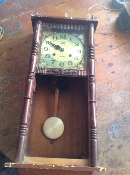 31 day wind up clock no key not sure clock working selling spares 1glass in tact bottom missing has pendulum