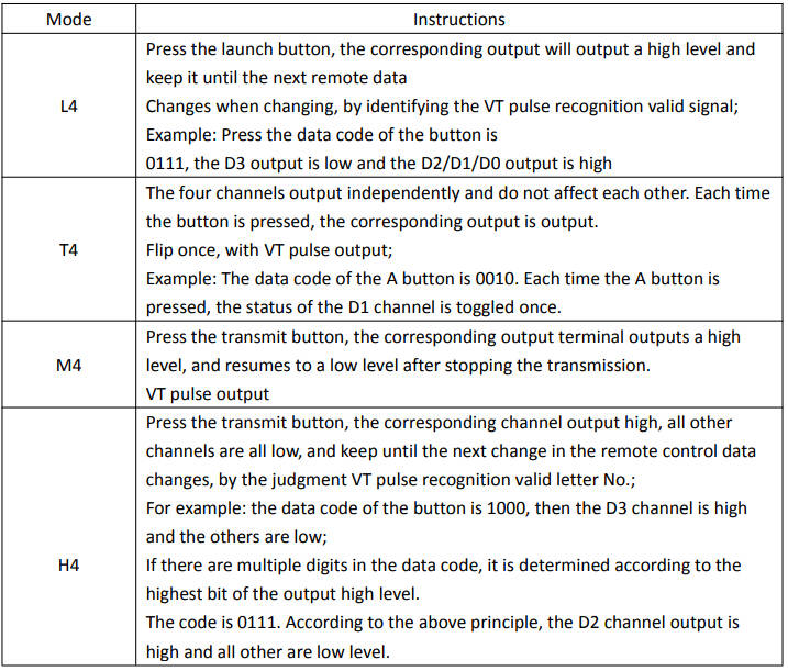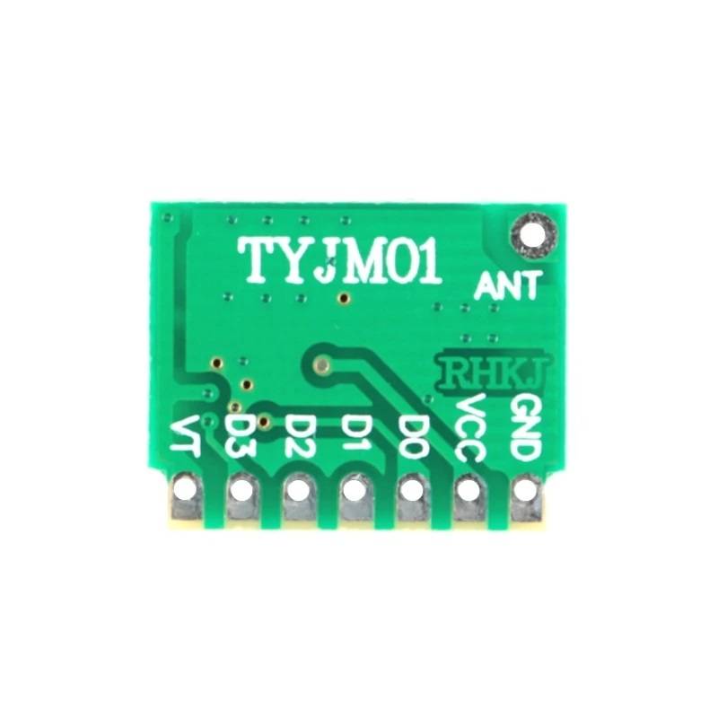1. Intelligent identification chip type, support EV1527, PT2262 learning code / fixed code (welding code) IC remote control mixed use 2. Compatible with most learning codes and fixed code (weld code) chips on the market, including EV1527, PT2262, HX2262, SC2260, SC5211, HS2240, etc. 3. Intelligently adapts to the oscillation resistance of the transmitting end, without considering the oscillation resistance of the transmitting end, and has strong versatility and is more convenient to use. 4. Good local oscillator radiation suppression ability, multiple modules can work together and will not interfere with each other, does not affect the receiving distance 5. TYJM01A-K supports four modes of operation: Latch, L4, T4, M4, and H4. 6. Learning and mode conversion through the learning button trigger Supports 4 outputs, the module comes with learning indicator and VT data valid indication, the operation is more intuitive and convenient 7. Decoder chip built-in EEPROM, support up to 32 sets of remote control memory 8. Wide operating voltage range: 2V ~ 5.5V 9. Module size: 18.8X14.8X5mm, small size, easy installation