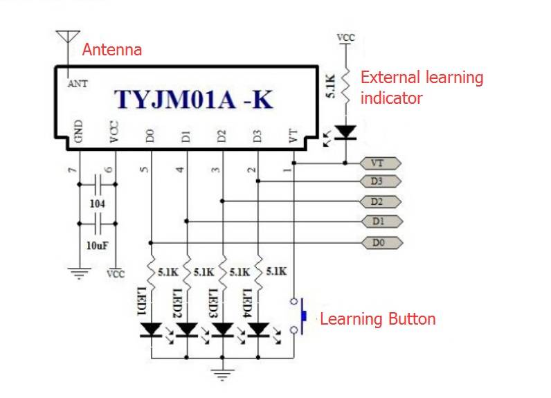 Module Working Principle In the pulse data string of each frame learning code (eg, EV1527) or fixed code (eg, PT2262), It consists of two parts: the address code and the data code. In general, in the same remote control, the address code of each key is the same, and the data code for each key is different; In the TYJM01A-K module, after learning, the module only memorizes the address code of the remote control button and does not memorize the data code of the button; The module can intelligently identify the learning code or fixed code, and extract the address code from the received data to be compared with the address code stored in the EEPROM. If the same, the corresponding output mode is correspondingly output according to the received data code.