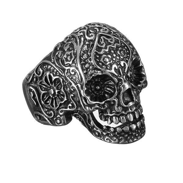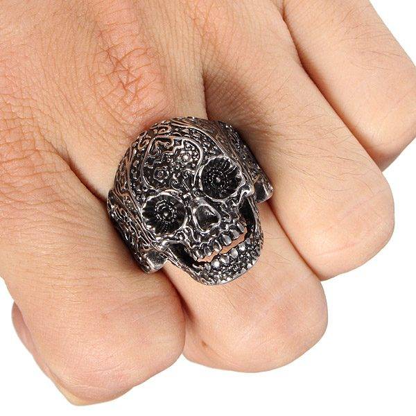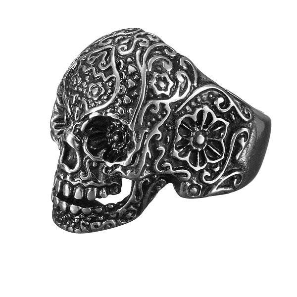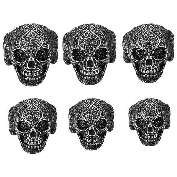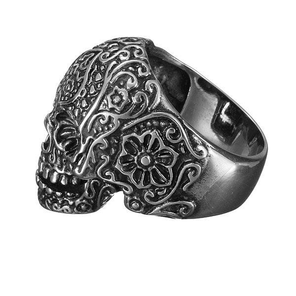 316L Stainless Steel Punk Carved Flower Skull Finger Ring Men Jewelry