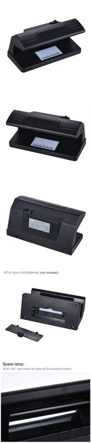 | Features: Ultraviolet(UV) money detector. Spare lamp: BLB-4W, can trace all types of fluorescent marks. For most European and Asian countries, such as Euro, Pound, Peso, Yen, Won & etc Not suitable for the US dollar Powered by 4 * AA batteries(Not included) Portable to carry Specifications: Model: 318 Light Source: UV (Ultraviolet) Battery Type: 4 * AA Batteries (Not included.) Counting speed: 600 sheets / minute Power Consumption: 2W Item Size: 190×90×50mm Package Size: 210×130×85mm Item Weight: 400g Package Weight: 730g Package List: 1 * Cash Detector (NOT including other things in the pictures) ![]() ![]() |