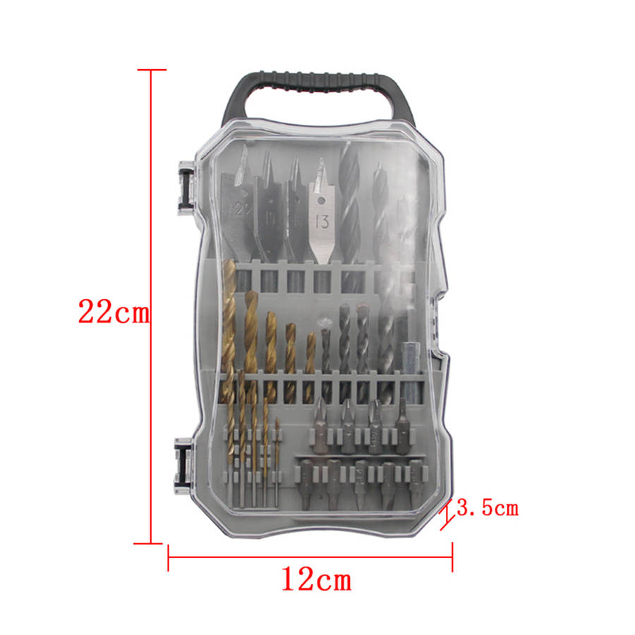 | Size | 1Pc Adapter: 1/4 Inch Hex Shank 4Pcs Flat Drill Bits: 13mm/16mm/19mm/22mm 3Pcs Three-point Woodworking Drill Bits: 6mm/8mm/10mm 4Pcs Construction Drill Bits: 4mm/5mm/6mm/8mm 10Pcs HSS Twist Drill Bits: 1.5mm/2mm/2.5mm/3mm/3.5mm/4mm/4.5mm/5mm/6mm/8mm 9Pcs Screwdriver Bits: PH1/PH2/PH3/T10/T15/CR-VT20/SL4/SL5/SL6  |
