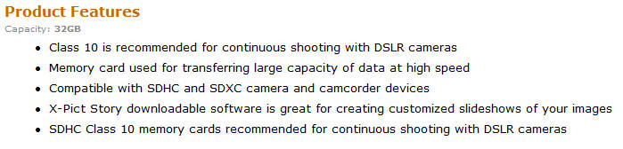 Sony SDHC Class 10 Memory Cards provide up to 22MBs transfer speed, which is ideal for continuous shooting applications with DSLR cameras. File rescue downloadable software allows you to recover photos and video that have been accidentally damaged or deleted. World's first downloadable software supporting AVCHD files.