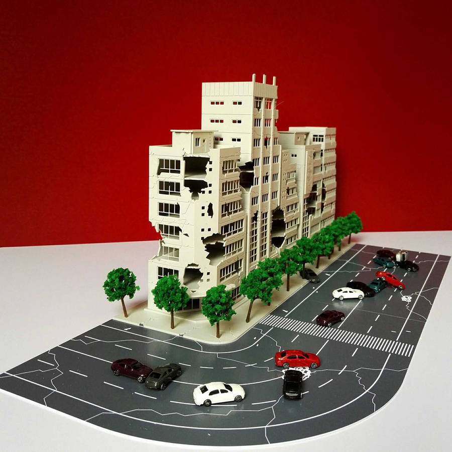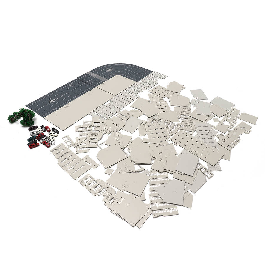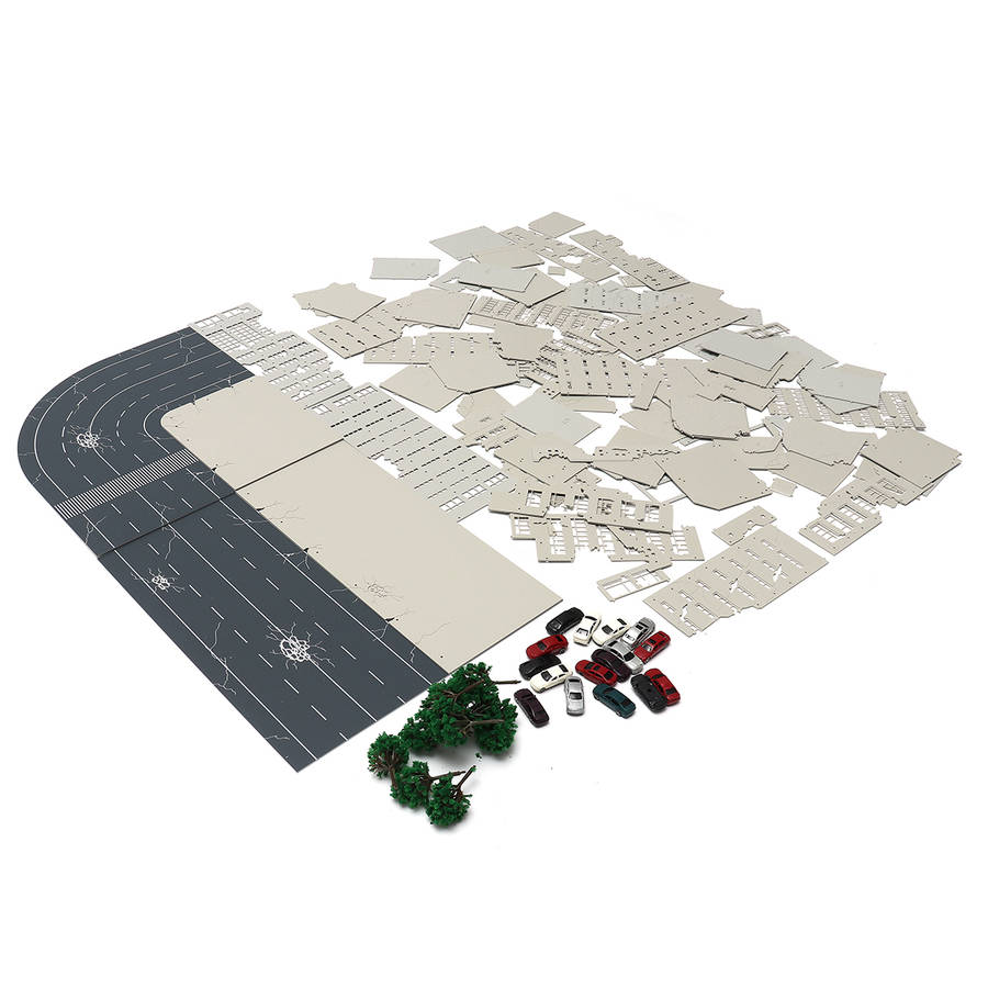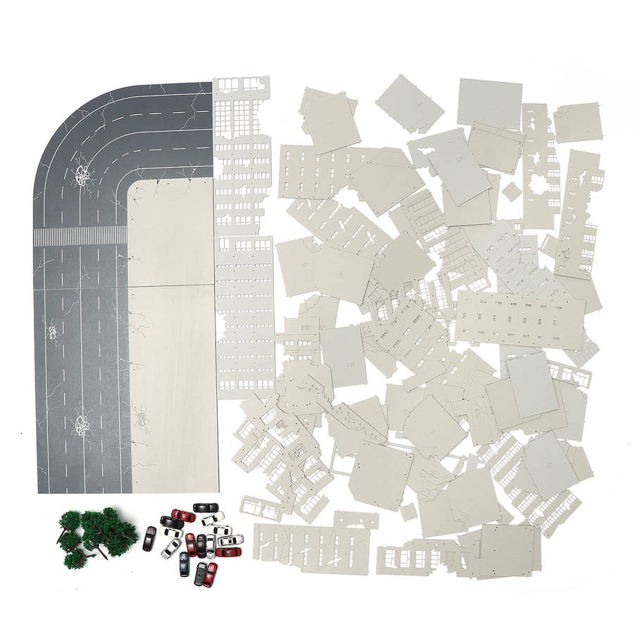 Package Included: 5 x War damaged buildings 1 x Combat damaged road base 11 x Small trees 16 x Cars (Need to assemble yourself)