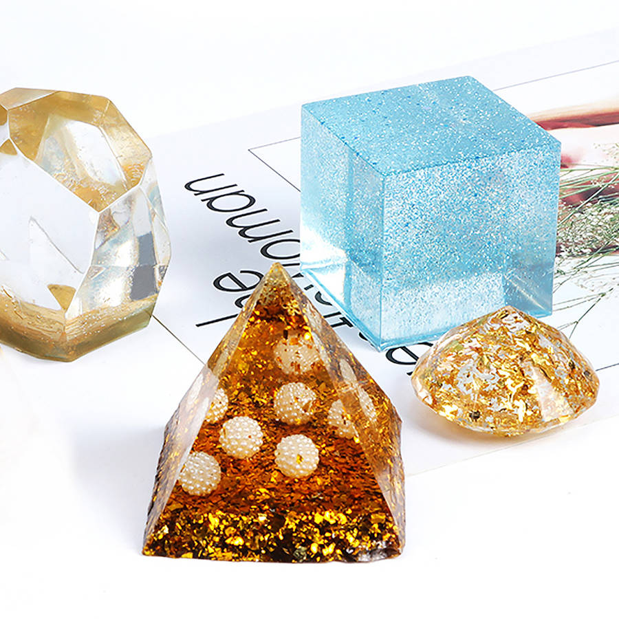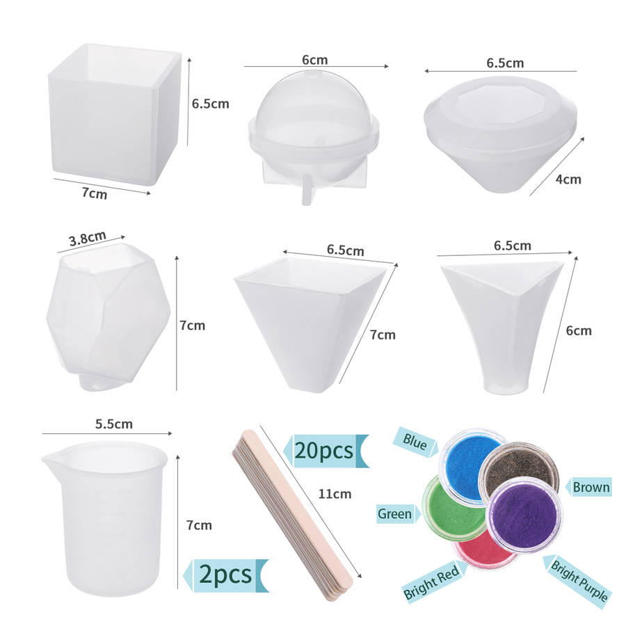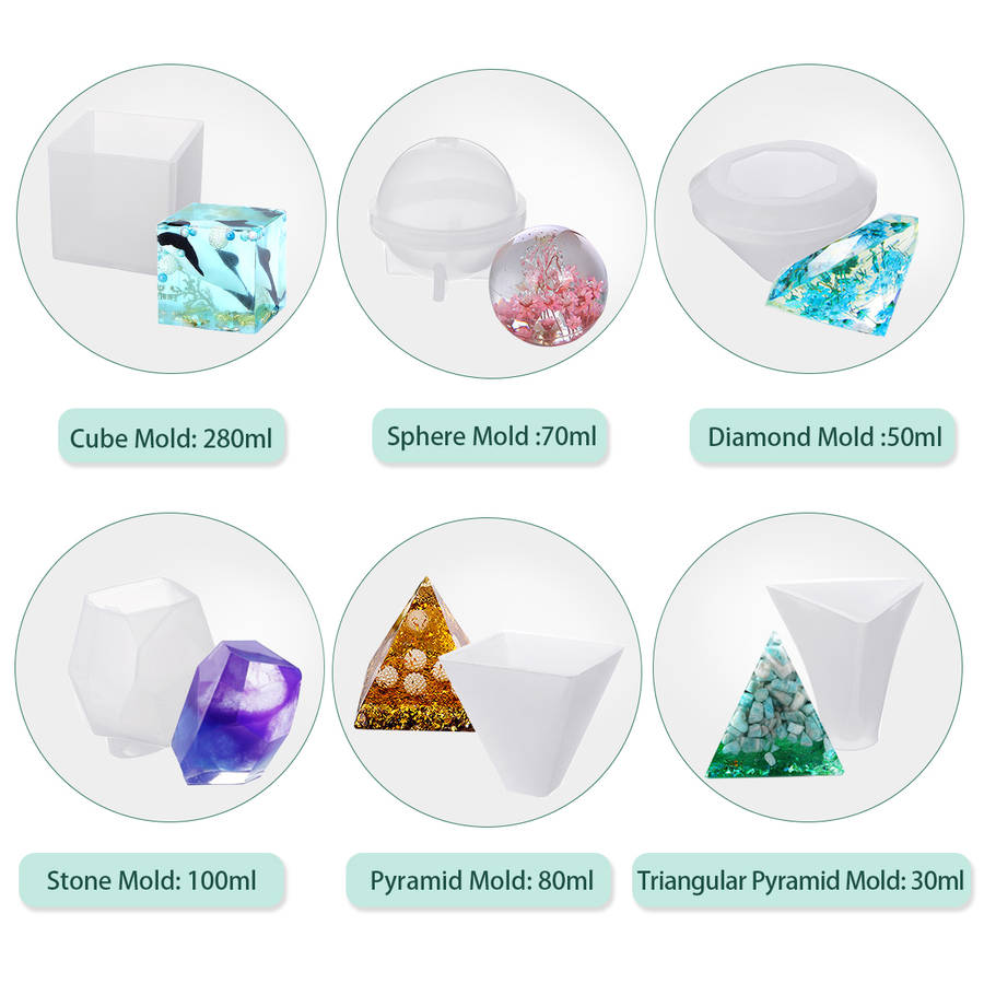 Features:1. LARGE RESIN MOLDS: This big resin mold kit includes different shapes silicone molds, like Cube, Pyramid, Sphere, Diamond, Triangular Pyramid and Stone paperweight mold, also comes with 2pcs measuring cups, 20pcs wood sticks, 5 flash powder. You could create different art projects and have a lot of fun.