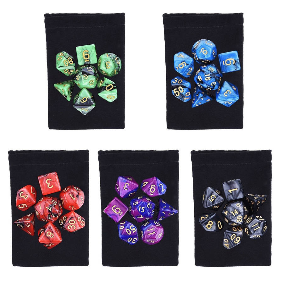 Package included: 1 * black-white Dice Set 1 * blue-black Dice Set 1 * green-black Dice Set 1 * red-black Dice Set 1 * purple-blue Dice Set 5 * Dice bag