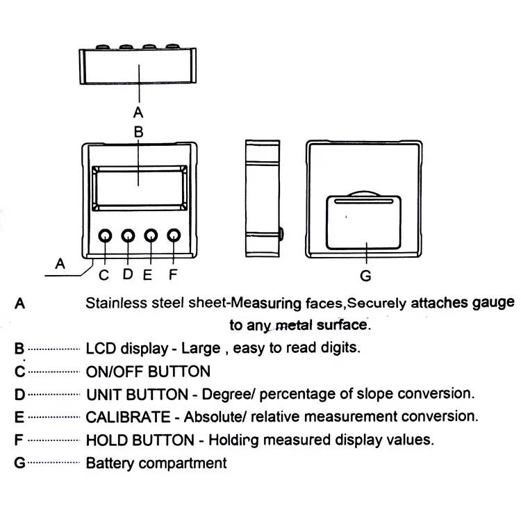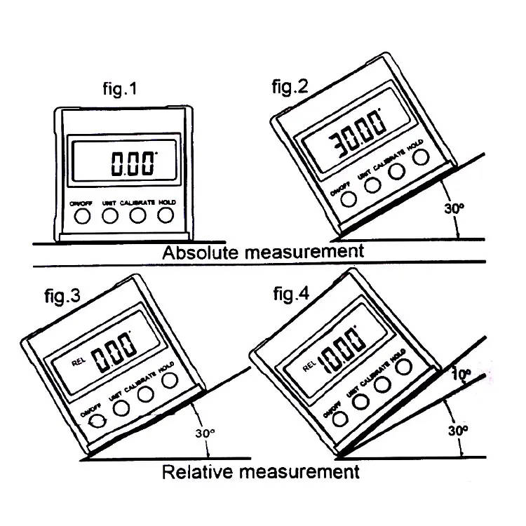 - Inclinometer or tilt gauge to set or check relative angles between surfaces, also works as true digital level for tight spots.