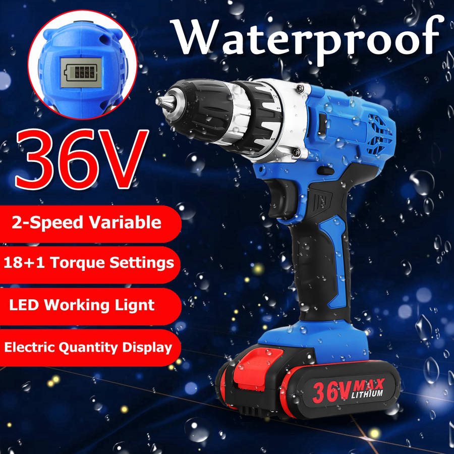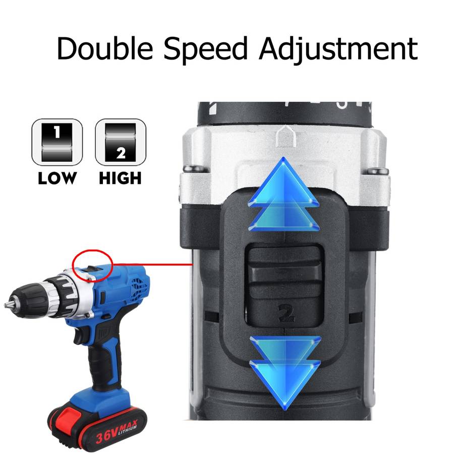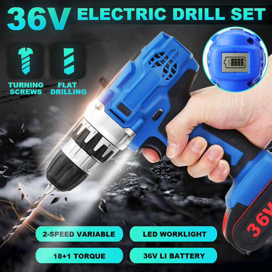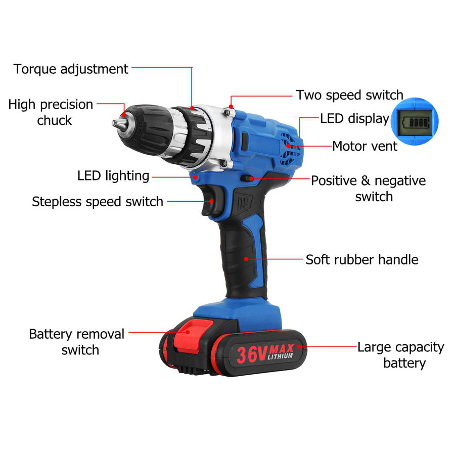 Cordless drill Double Speed Adjustment LED lighting 1/2Pcs Large capacity battery 18+1 torque adjustment 0-350r/min, 0-1350r/min Features: 1. Powered by 36V LI-ION rechargeable battery, provide longer running time and more power. 2. High efficiency brushless motor, Strong power and up to1350RPM of speed. 3. 18+1 torque adjustment, delivers 18+1 torque settings, adjust as needed. 4. High/Low 2-speed variable, 0-350RPM and 0-1350RPM , for a wide range of applications. 5. Electric Quantity Display, back integrated LED display, electric quantity condition is clear. 6. With LED working light, provides illumination in dark spaces as you work. 7. Ergonomic comfort grip handle provides ideal balance and tool control. 8. 3 in1 forward / reverse / lock switch, support forward / reverse driving and safe locking. 9. 2 stage settings. 2 drill ( flat drilling and turning screws.) modes for high precision working. Specification: Input: 100-240V AC Battery Voltage: 36V Max No Load Speed: 0-350r/min, 0-1350r/min Chuck: 0.8-10mm LED Display: Electric Quantity Display Size: 215mm*200mm/8.5*7.8 Package Content: 1 x Cordless Drill 1 x Battery charger 1 or 2 x Battery(Optional)