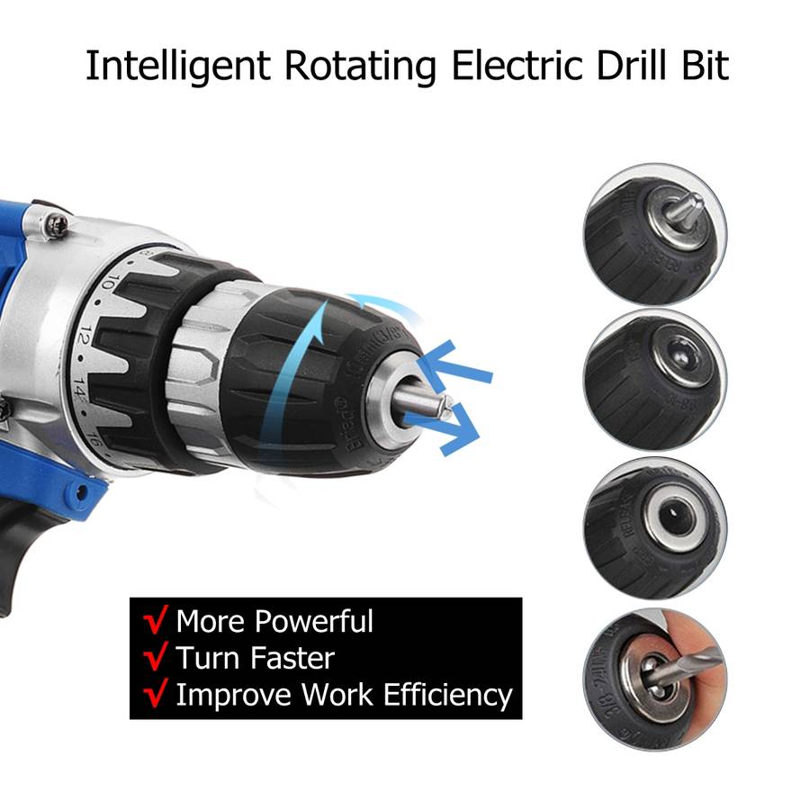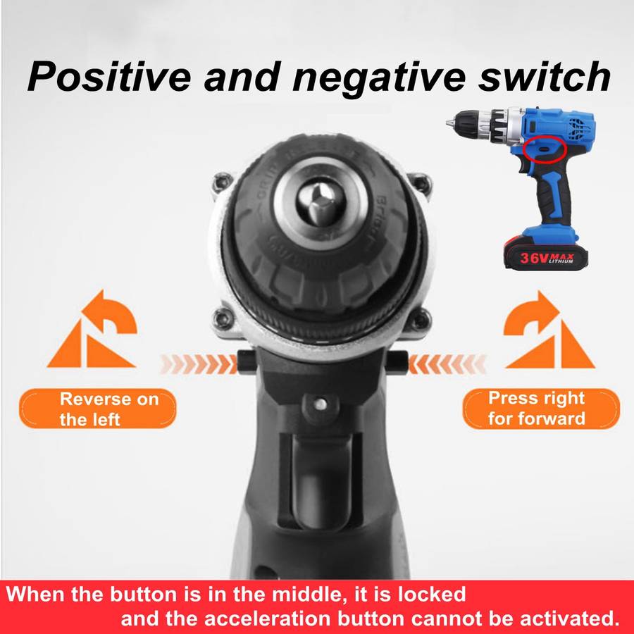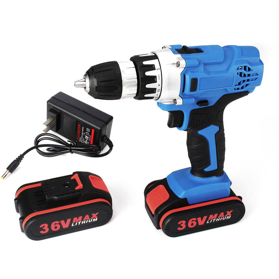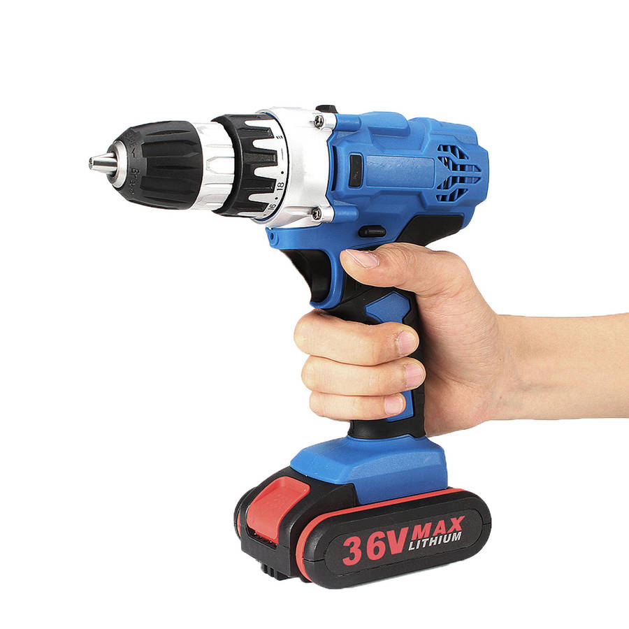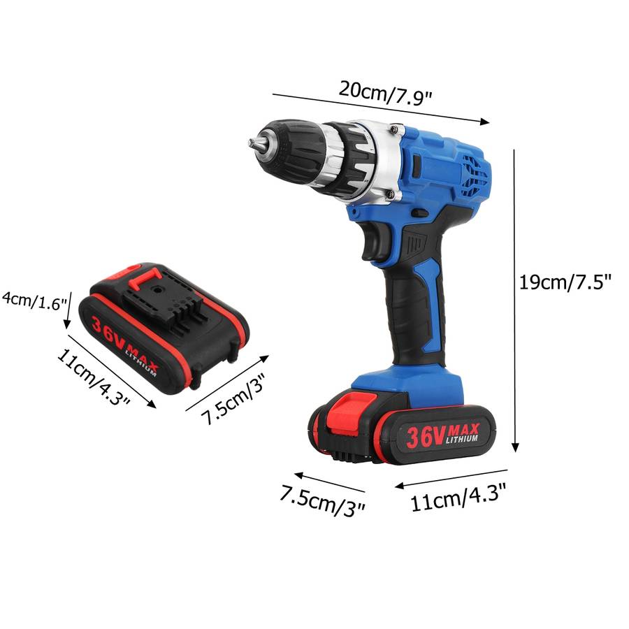 Cordless drill Double Speed Adjustment LED lighting 1/2Pcs Large capacity battery 18+1 torque adjustment 0-350r/min, 0-1350r/min Features: 1. Powered by 36V LI-ION rechargeable battery, provide longer running time and more power. 2. High efficiency brushless motor, Strong power and up to1350RPM of speed. 3. 18+1 torque adjustment, delivers 18+1 torque settings, adjust as needed. 4. High/Low 2-speed variable, 0-350RPM and 0-1350RPM , for a wide range of applications. 5. Electric Quantity Display, back integrated LED display, electric quantity condition is clear. 6. With LED working light, provides illumination in dark spaces as you work. 7. Ergonomic comfort grip handle provides ideal balance and tool control. 8. 3 in1 forward / reverse / lock switch, support forward / reverse driving and safe locking. 9. 2 stage settings. 2 drill ( flat drilling and turning screws.) modes for high precision working. Specification: Input: 100-240V AC Battery Voltage: 36V Max No Load Speed: 0-350r/min, 0-1350r/min Chuck: 0.8-10mm LED Display: Electric Quantity Display Size: 215mm*200mm/8.5*7.8 Package Content: 1 x Cordless Drill 1 x Battery charger 1 or 2 x Battery(Optional)