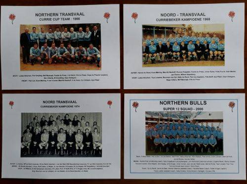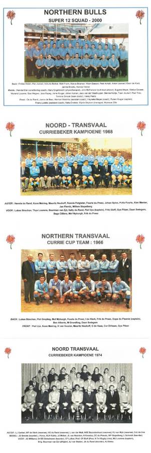 Northern Transvaal Currie Cup teams : 1966, 1968 (CCup champions), 1974 (CCup champions), 2000 Northern Bulls Super 12 squad