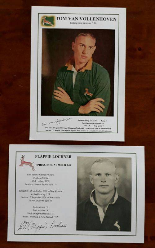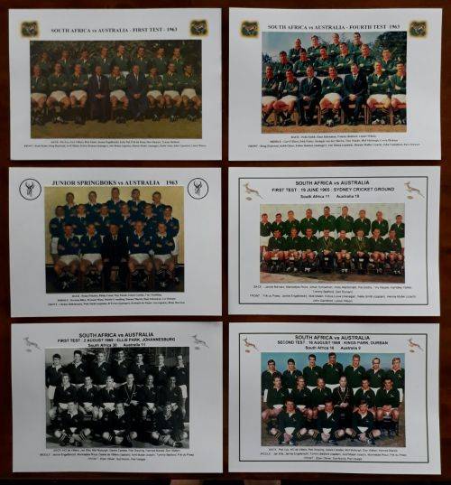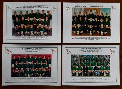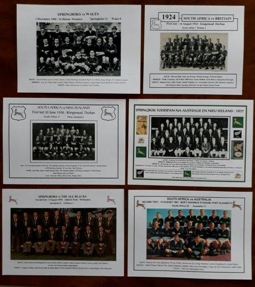 37 Gloss photo's/pictures of Springbok and provincial rugby teams, plus two player profile pictures with stats. The photo/pictures are glued to 240gsm boards measuring 210mm x 300mm (A4). The heading, logos and names of the players are printed on the board. Following teams :