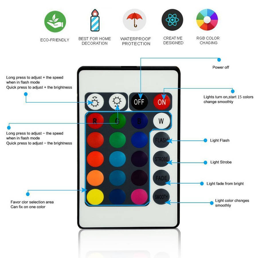 Technical Specifications: Material: ABS Power: 3W Input Voltage: DC5V Remote control Battery needed: CR2025 (Included) Lamp base Battery needed: 3pcs AA batteries(NOT Included) Prodcuct color: Black Color: 15 Colors changing Dimensions: 100*45MM / 3.9*1.8