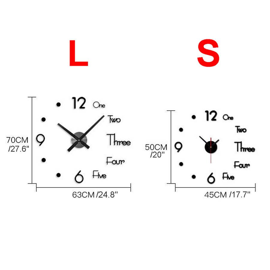 Features: a Simple and stylish, crystal clear, creative. a Not easy to fade, bright luster, mirror effect. a With double-sided tape on the back. a Easy to install. a Silent movement. a Application: home, office, coffee shop, etc. Specifications: a Model: F69760 a Material: Acrylic a Color: Black a Size: L/S a L: 70x60cm/27.6``x24.8``(steel plate) a S: 50x45cm/20``x17.7``(Acrylic plate) a Diameter: 40cm/15.7inch Package includes: a 1 x Wall clock Warning: a Due to manual measurement, please allow 1-3cm error, thank you a Due to shooting problems such as light, there will be chromatic aberration, please be careful.