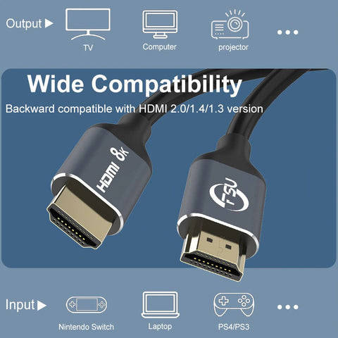 - The 8K HDMI 2.1 cable supports 8K @ 60Hz, 4K @ 120Hz / 60Hz, 2K 144Hz,