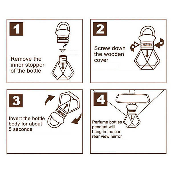 1.Can not drink, keep away from children 2.The use of essential oils should avoid contact with the eyes, mouth, nose, away from sources of ignition. 3.Should ensure that the level of the bottle, the bottle upwards. Double-sided adhesive should be firmly bonded with the adhesive surface. 4.Essential oils can be re-used after filling, each filling quantity not to exceed 20 ml, to avoid oil spill, if overflow, immediately dry with a cloth. 5.The car when attention select the installation location, avoid installing the airbag or impede the driver's line of sight at the location.