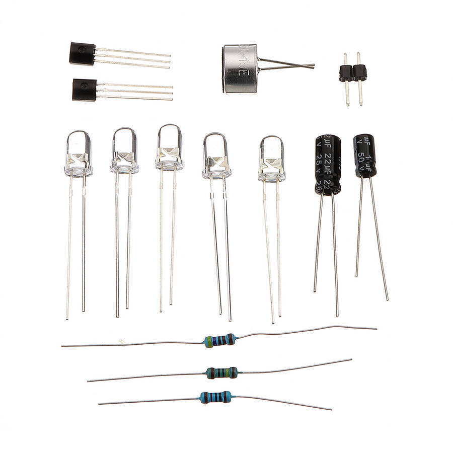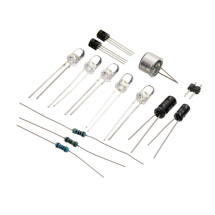 Description: Circuit functions: With the sound of music or other sounds, LED lights follow the rhythm of the sound (the speed of the sound) and flicker. After successful welding, you can feel the wonderful combination of sound and light. Working voltage: 3-4.5V ( if you need a higher working voltage, please add a current limiting resistor on LED, usually tens of euro to 100 euro). Circuit principle: Sound-controlled LED melody lamp circuit consists of power supply circuit, microphone amplification circuit, LED luminous indicator circuit, power supply by JP input, C1 filter power supply circuit. MIC converts sound signals into electrical signals, which are coupled by C2 to Q2 amplification. The amplified signals are sent to Q1 base. Q1 drives LED to emit light. The louder the sound, the brighter the LED. Package Included:
