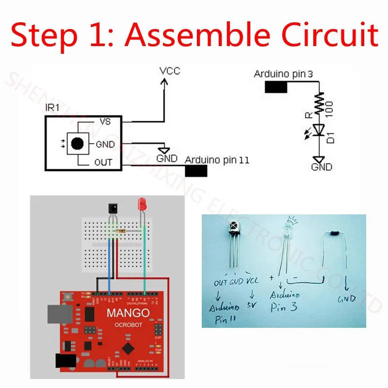 You will need one for this. I used a UNO, but just about any should work. First wire up the infrared receiver that came with your kit. There are 3 wires, PWR, GND, and SIG, I used port 11 for SIG. Note! some readers have reported that their sensor has different wiring, double check it yourself.