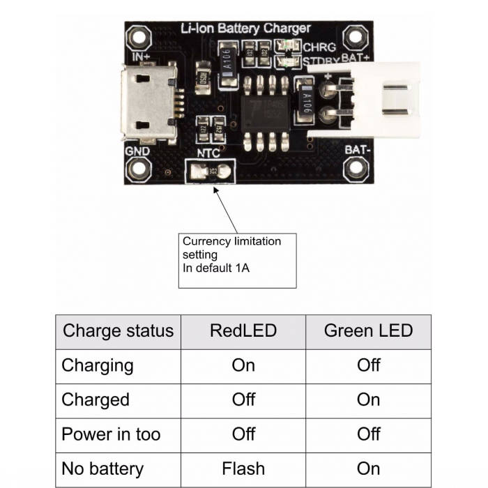 Feature: The Micro-USB Li-Ion Battery Charger is a complete constant current/constant-voltage linear charger for single cell lithium-ion/Lithium Polymer (LiIon/LiPo) batteries. The Charger base on TP4056. The ideally suited for portable applications. And the Li-Ion Battery Charger can work within USB and 5V wall adapter. Other features include current monitor,under voltage lockout, automatic recharge, and two status pin to indicate charge termination and the presence of an input voltage. Connection: Power is supplied to Micro-USB socket OR to inputs IN+/GND Li-ion battery can be connected to XH power socket (XH cable included) or outputs BAT+/BAT-. Charge indication has 4 status (see pic) 4.5~5.5V / 4.2V / 1A / Micro USB / TP4056 Package includes: 3 x MicroUSB Li-Ion Battery Charger 3 x Cable