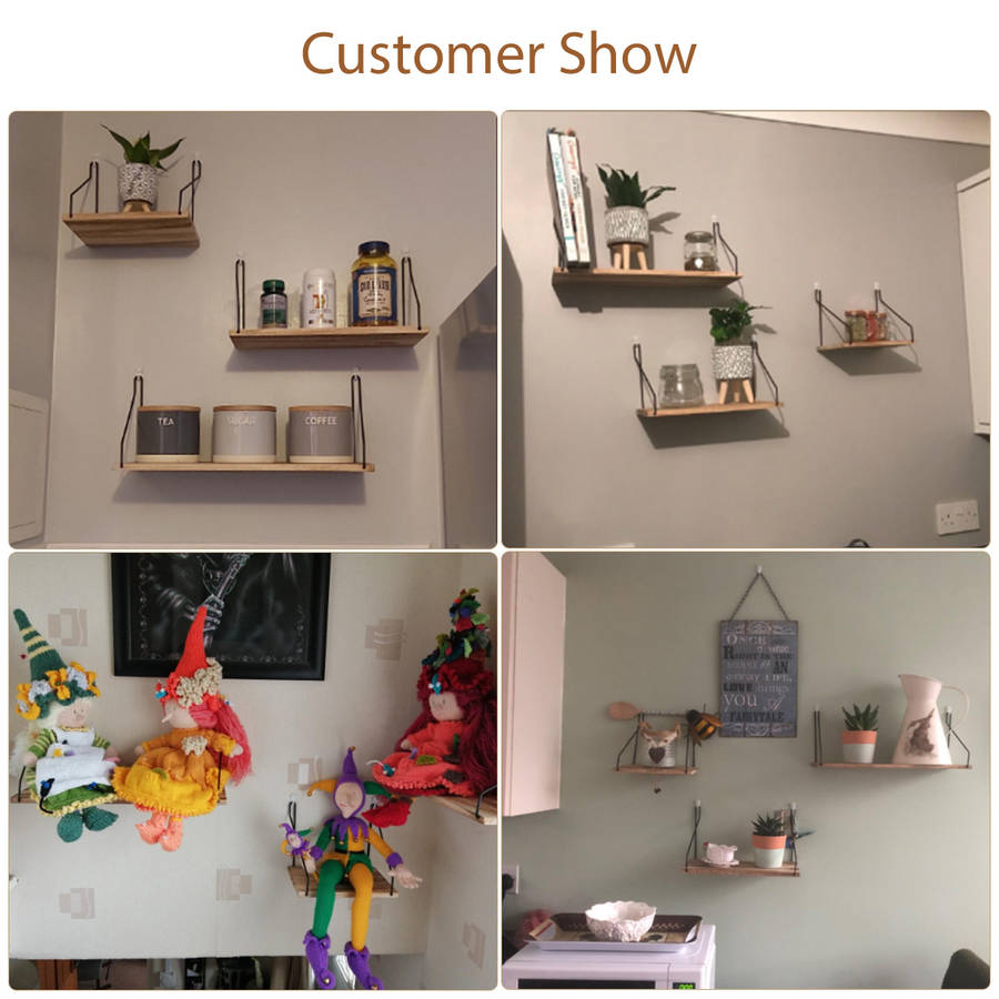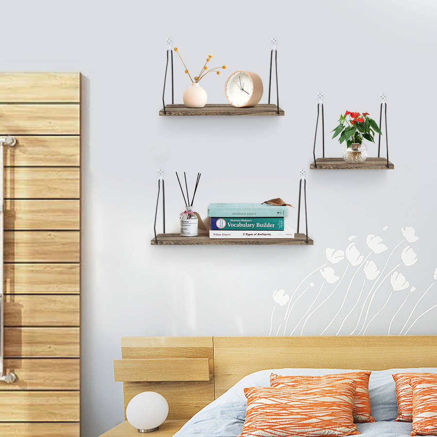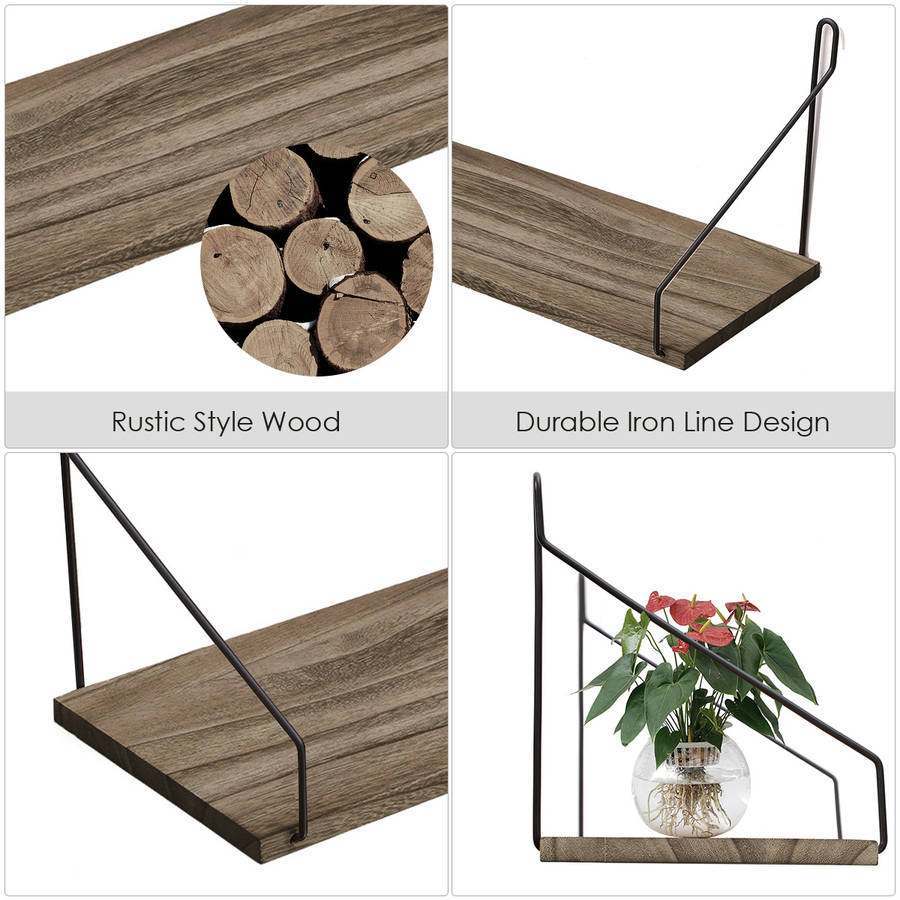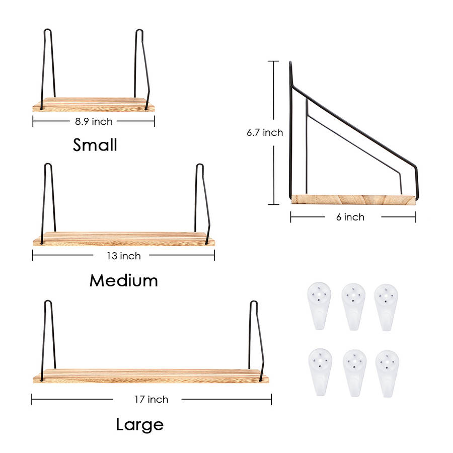 Features: Country Rustic Wall Shelves:Perfect for storing and displaying, it will bring a bit of country rustic style and sensible organization to your home with this beautiful wall wood shelf.Countryside style wood boards and modern black metal brackets.Simply decorate empty wall space above desk, fireplace, entryway, between windows. Set of 3 Storage Shelves: Large 43x 15x 17cm/17x 6 x 6.7, medium: 33 x 15 x 17cm/13 x 6 x 6.7, small: 22.5 x 15 x17cm/9x 6x 6.7.These hanging shelves can be used as storage shelves, wall display standing shelves.Our wall mounted shelf can be backdrop to decorate your bedroom,bathroom and kitchen.Simple and convenient design floating shelves make your home become tidy and fashion. Really light weight and easy to assemble wall hanging shelf. Sturdy and Easy to Install:We provided all the mounting accessories and you can just follow the instruction and mount this shelf in a minute.Gross Weight : 690g.Once putting up, each shelf can hold up to max 30lb and tested by durability.A flat surface provides a perfect platform for storage and display, while a 6 wide wood board helps keep the shelfas contents secure.Constructed of beautiful wood with black metal frame.Tired of a usual wall Come and take this floating wood shelf to home. Multifunction:Multi-purpose display shelves for products, collectibles, small plants, toys, jewelry, frames, Christmas decor, spice jars,display photo frame, vase, book, salt bottle and more ,Great for bathroom,bedroom, living room, office, kitchen.